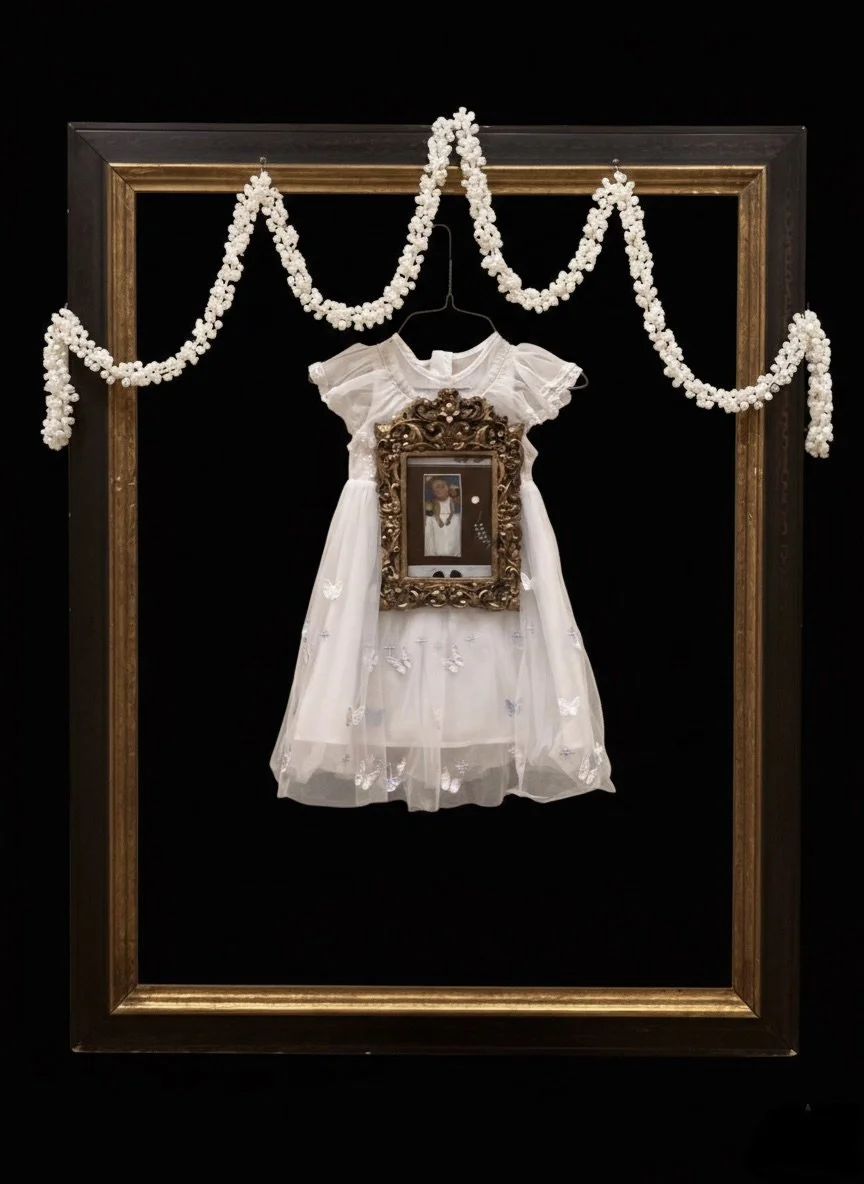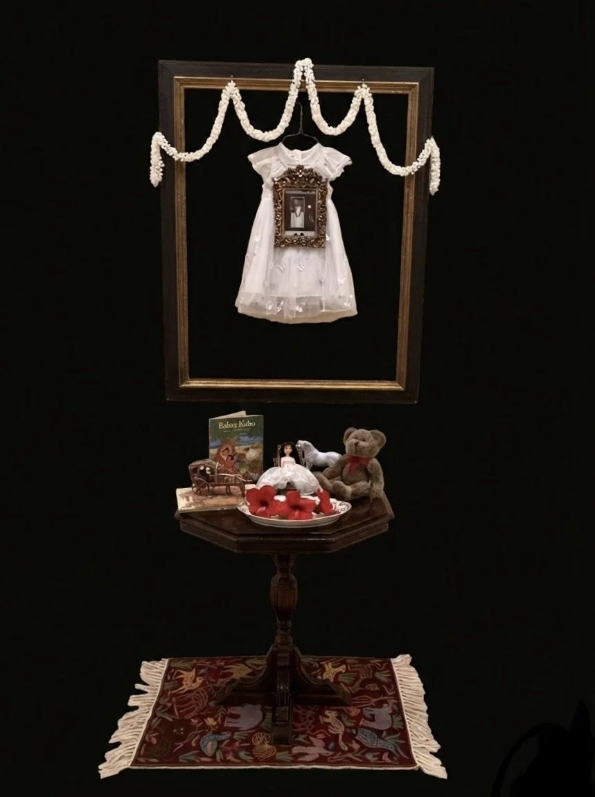 In this work, I have gathered a small painting of that child and surrounded it with items from that time: books, toys, candies, the gifts they never got to hold, and objects drawn from our shared heritage and roots in the Philippines.
